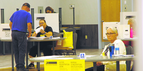 People arriving at the Provost Recreation and Culture Centre cast their votes in the ballot box during the federal by-election on Monday, August 18. Pierre Poilievre won 80.4 percent of the vote and regained a seat in Parliament representing the Battle River-Crowfoot constituency. See story in The Provost News dated August 20, 2025. ©Provost News Photo. |