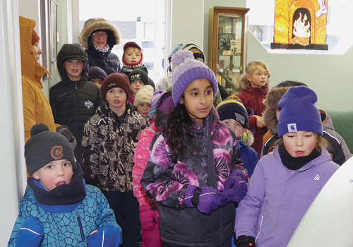 Grade 1 and 4 St. Thomas Aquinas School students spread Christmas cheer by singing several festive songs as they stopped in at The News office. They made rounds downtown Provost on Tuesday afternoon, December 9. They’re accompanied by Grade 1 teacher Melissa Mercer (left) and instructional assistant Tracy Biever (back at left). ©Provost News Photo. |