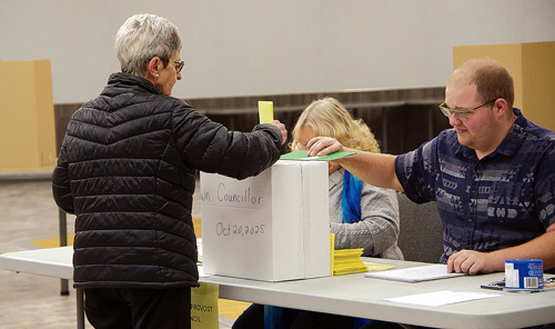 Voters across Alberta were at polls for municipal elections on Monday, October 20. Here, a Provost resident puts her ballot in the box after marking her choices for who should be councillors for the Town of Provost. Polls were open 10 a.m. - 8 p.m. at the Provost Recreation and Culture Centre which also included voting for East Central Catholic School board trustees. Voting for the trustees also took place at the M.D. of Provost No. 52 office. This photo was taken just before 5 p.m. See election results in The Provost News dated October 22, 2025. ©Provost News Photo. |