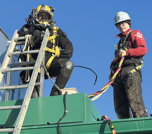 John’s scuba-diving goggles are spotted with water moments after exiting one of the Town of Provost’s two water tanks on Thursday, February 5, assisted by Chuck (last names not supplied). They’re for the Aquatech Marine Services out of Eckville, Alta. The water temperature in the tanks is 3ºC. To compare, the Pacific Ocean near Vancouver was recorded in early February as 7º C. See other photo, related story in The Provost News dated February 11, 2026. |