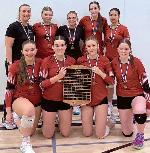 The St. Thomas Aquinas senior girls’ volleyball team show off their plaque and gold medals after taking the win at the 1A Central Zone playoffs in Daysland on Saturday, November 22. They’re to advance to provincial finals in Manning, Alta. from November 27 - 29. Pictured back from left: Head coach Tamara Weyenberg; Tayten Grzyb, Brielle Gregory, Rylei Varty and Brieanna Stuber. Front: Kiera Stempfle, Brenna Werenka, Ava Small and Quinley Sweetman. Missing: Sofia Banaag. Photo submitted. |