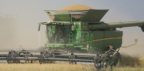 A combine operator for Menzies Farms Ltd. keeps an eye on the edge of the field while rounding a corner by Range Road 30 west of Provost on Monday, September 8. While the grain tank can be seen nearing capacity in this picture, moments later the farmer stopped to fill a parked super B truck with grain to be hauled away for eventual market. ©Provost News Photo. |