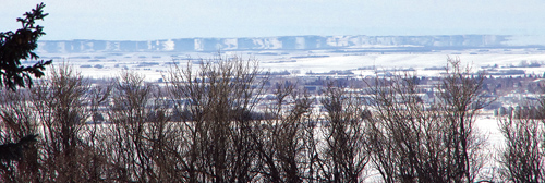 What seems to be a near-annual occurrence near Provost (partially shown behind trees) is an illusion of odd, tall cliffs stretching skyward; and south to north before dissipating (at right). Looking west from Ferris’s hill, this photo was taken December 31, 2025 at 1:26 p.m. Mirages occur when light rays are refracted and curved by passage between air layers of different density and temperature.For more details, see The Provost News dated January 7, 2026. ©Provost News Photo. |