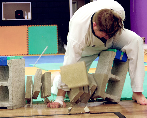 After taking a moment to visualize and focus, followed by a loud kihap, Champion Taekwondo instructor Blaine Sherring powers through four bricks with a palm strike on Saturday, April 11 at the Champion Collective in Provost. Five students challenged their black belt tests. See more photos in The Provost News dated April 15, 2026. ©Provost News Photo. |