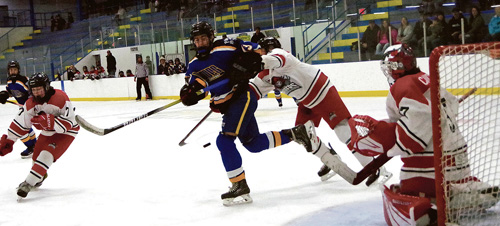 | In Provost Minor Hockey the U-15 Provost Blades are seen in these two photos on home ice facing Smoky Lake in playoff action. Provost won this round 4 - 2, but took a 9 - 4 defeat the next day. The Blades are to travel to Smoky Lake, Alta. on Sunday, February 22 for game three. |